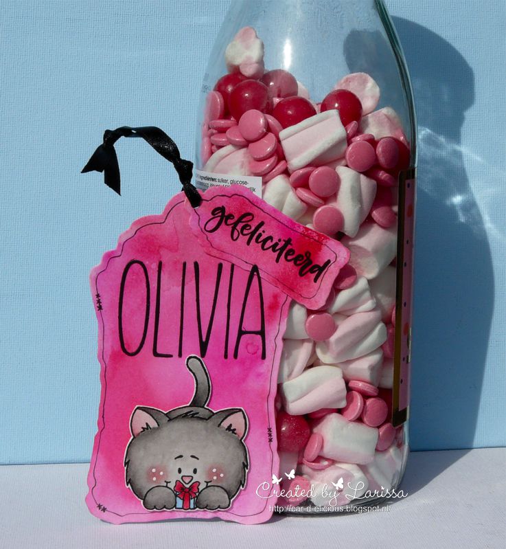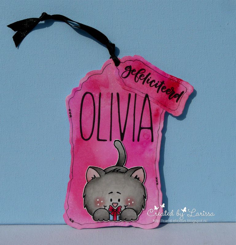 Tombow dual brush markers. I coloured with 2 shades of pink and a red marker on a sheet and sprayed it with water and then I placed the tag on the sheet. This way you get some nice shaed of pink and red on your tag. I have put the tags back in the dies and then I doodled the inside lines of the tags with a black fineliner on the tags. I have die-cut the name Olivia from black cardstock with the Cutaway alpha die from Waffleflower. On the small tag I stamped the sentiment gefeliciteerd (congratulations) from the stampset