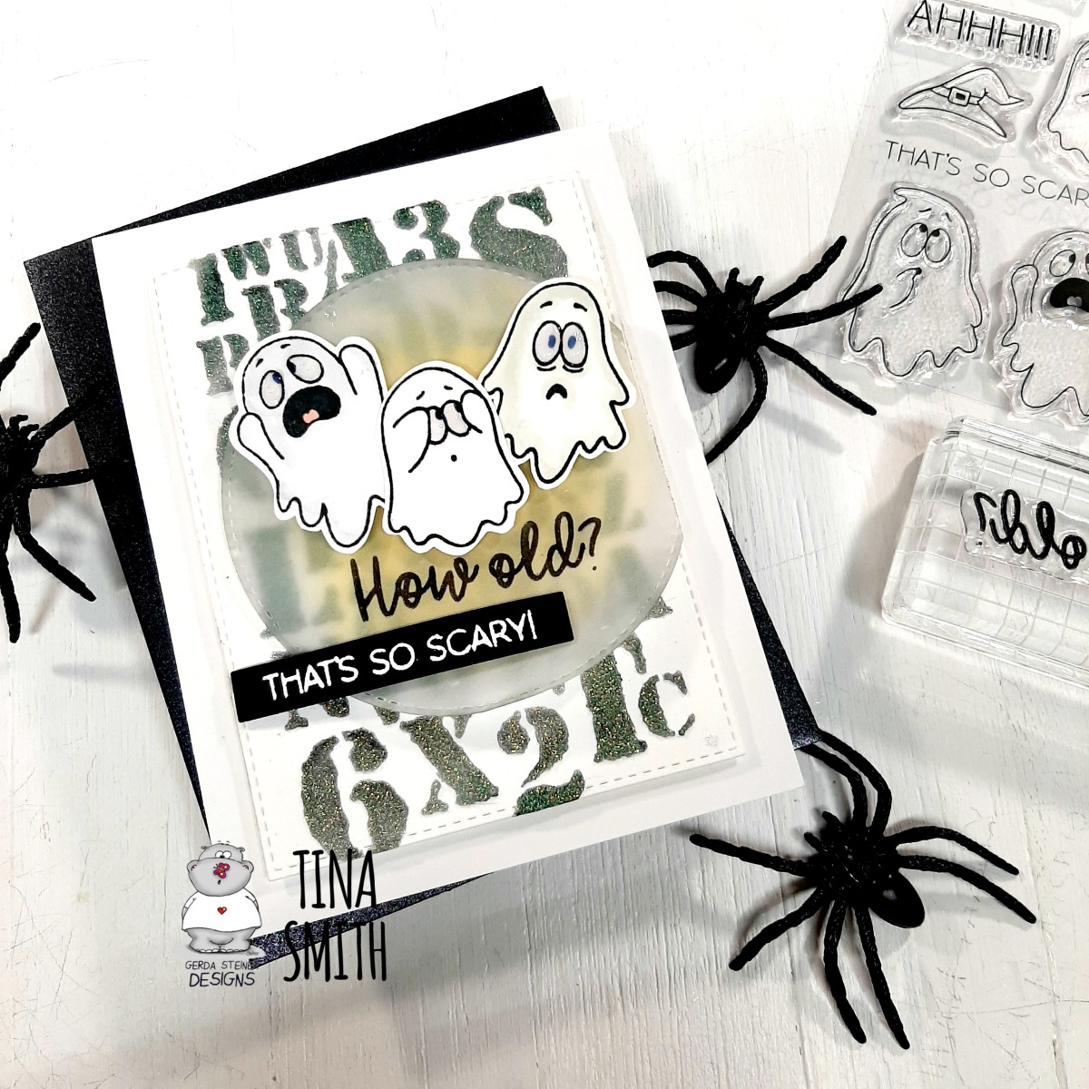 Hello and Happy Wednesday Crafty Friends!  Tina here from Cards & Coffee Time, today we are creating a scary-fun Birthday card with the BRAND NEW Ghosts Stamp Set available right now over at the Gerda Steiner Designs Shop , the Ghosts Coordinating Die Set are available too!!  Okay…..I promise I never thought I would say this....How adorably cute are these ghosts, I mean really!!  They can tell a story with out any words with those fun expressions:)  Coloring ghosts are super easy I just added a touch of color with my copic markers.  My background was created with a stencil, distress ink and glitter paste for some sparkle:) I just love how it turned out, kind-of masculine but I could probably give it to any birthday friend!