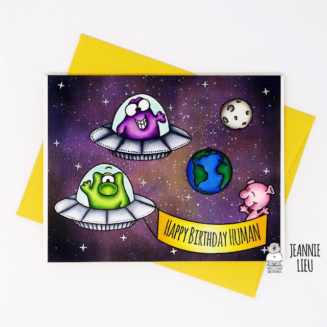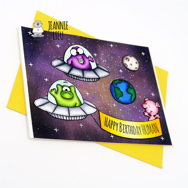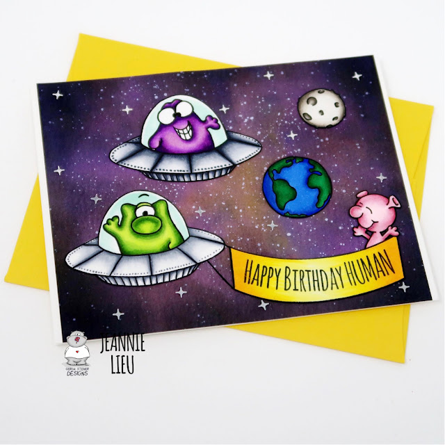 I stamped images from the stamp set using Alien Invasion using a black ink. Then I colored them up using copic markers. I started out with just one alien in the little spaceship, the banner and the earth but after coloring it up, I wanted to fill up my galaxy a bit more with two more aliens and a moon.