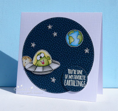 Polychromos pencils and the black glaze pen. I masked the ufo and that way I could stamp the alien inside it. I have fussy cut all the images. I have die-cut a large circle with the
