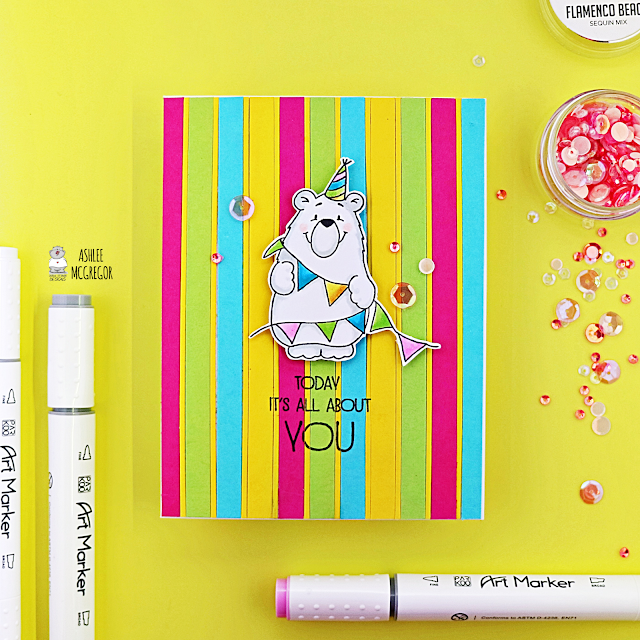 I created a fun colourful background and then added stamped the "Today is all about you" sentiment straight on top....