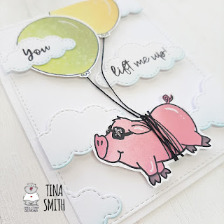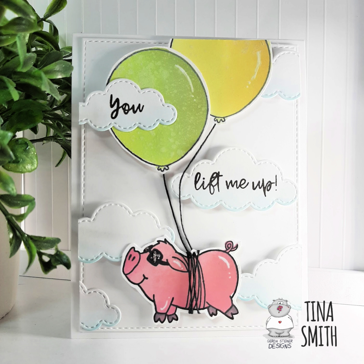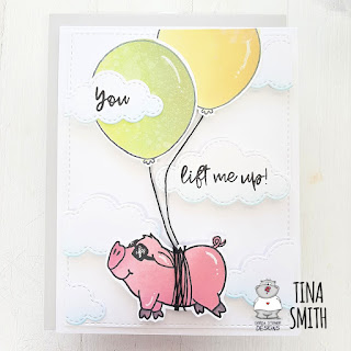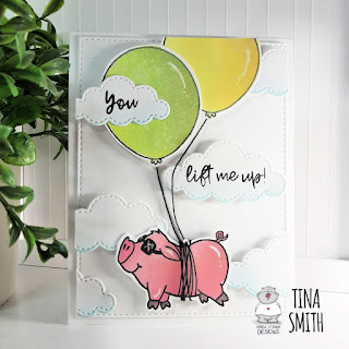 Hi there!  Tina here with a fun and uplifting card tutorial to share with you today. Have you seen the "You Lift Me Up" stamp set  over at the Gerda Steiner Designs Shop?  It's fairly new and so stinking adorable!  I mean what is not to love about a piggie and balloons, maybe the encouraging sentiment, right:)