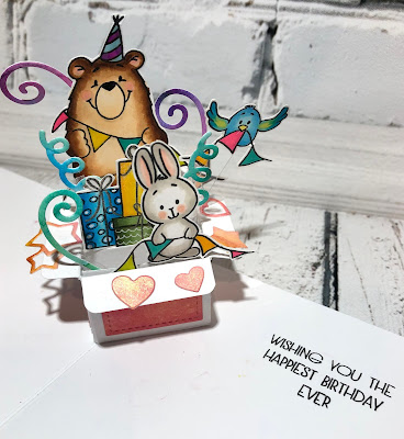 Hello, it’s Karen here today and I’m back with another card featuring the Birthday Bear stamp set. This is such a fun, festive stamp set and I thought these characters would go well in a pop up box card. I’ve kept the front of my card quite simple because the fun is really on the inside.