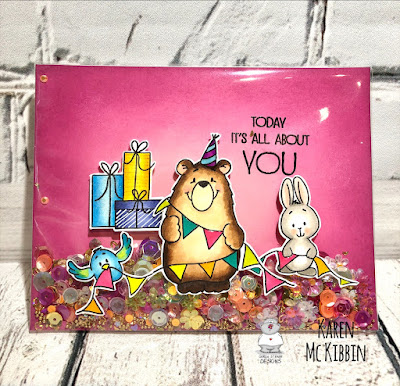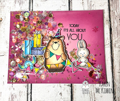Hello everyone, it’s Karen here today and I’ve got a full size shaker card today made with a new stamp set from Gerda Steiner Designs called “Birthday Bear”. This is an easy card to make and it even uses a surprise material!