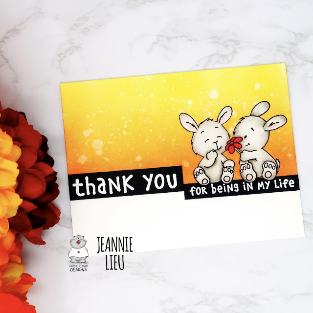 In this set, there are three sentiments that you can mix and match. I chose to use two of them "Thank You" and "for being in my life". I wanted to heat emboss them on black cardstock and to use the second sentiment as a place for the bunnies to sit. I staggered them slightly just so it looks like the perfect place for the bunnies.