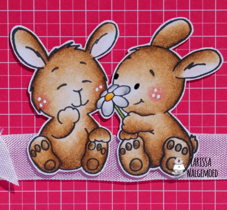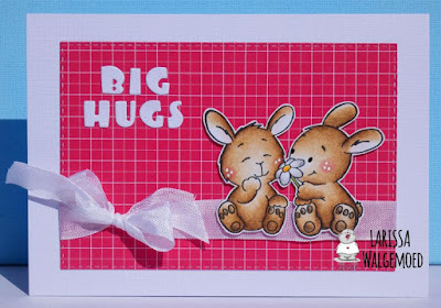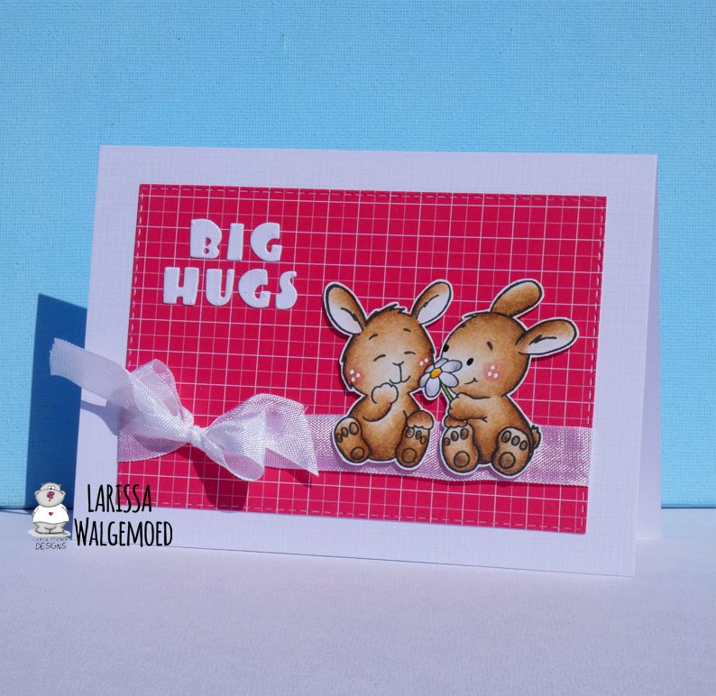 This time I have made a card with the Bunny friends (clear stamp) from Gerda Steiner designs. I have coloured the image with my Polychromos pencils, the black glaze pen and a white gelpen. I have fussy cut the image. With the Crea-nest-lies XXL 24 from Crealies I have die-cut a rectangle from red patterned paper from the Celebrations pretty paper bloc (PK9131 - Retired) from Marianne design. I wrapped white seam binding around it and then I glued it on a white card. I used foamtape to glue the bunnies on the card. I have die-cut the sentiment Big hugs from white cardstock with the Mini alpha & number dies (retired) from CC. Designs and glued it on the card.