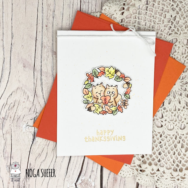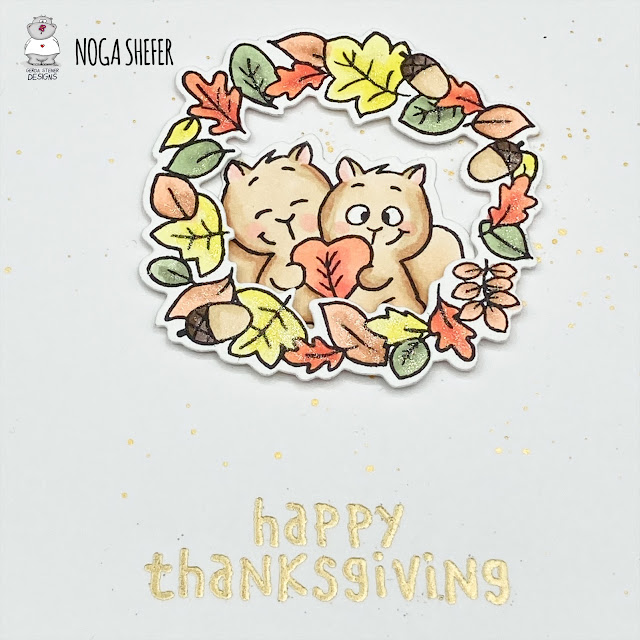 Next I colored the adorable images using copic markers. I glued the leaves circle to my panel with foam tape for dimension and the squirrels peek below, how cute is this??