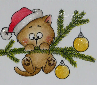 I stamped a cuple of different images from the stampset Christmas kitties from Gerda Steiner designs. Then I coloured the images with my Polychromos pencils and the black glaze pen. I have coloured the ornaments and the trim of the christmas hat with the Clear Spectrum noir sparkle pen. I have die-cut the image with the Crea-nest-lies XXL 36 from Crealies and then I adhered the image on black cardstock.
