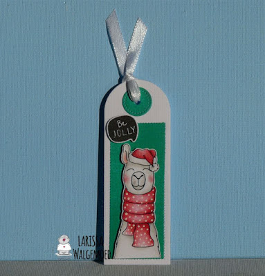 I have coloured the background of the tags with distress inks. I put masking tape on the edges of the tag and then I coloured the first tag with Lucky clover distress ink. I also coloured the enforcement ring with Lucky clover distress ink. I glued the llama on the tag and then I used a white gelpen to raw dots on the scarf. The sentiment is from the stampset