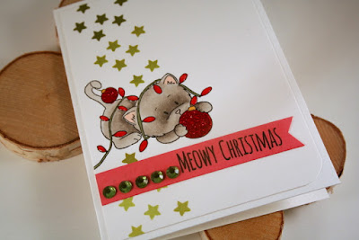 When working on a clean and simple card simple it can be beneficial to keep the color story minimal. This is why I opted for a neutral color cat. I'm a big fan of adding sparkle on Christmas cards so here I added gems, glitter, and glossy accents. I love that I was able to sneak in some gem destashing into such a stamp heavy design.