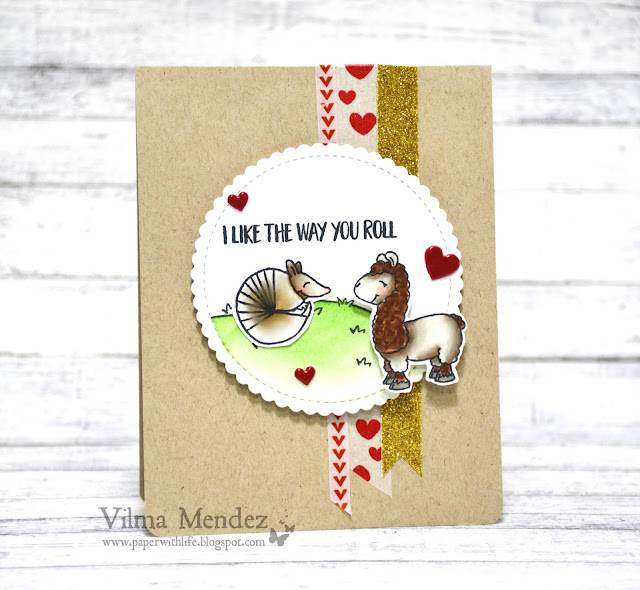 Ahora les comento un poco acerca de la tarjeta que realice: Esta tarjeta está hecha en la medida estándar A2 (4.25"x5.5") y con una base de cartulina kraft, en el fondo coloque cintas de washi tape. Estampe la imagen de llama y un armadillo en cartulina blanca y tinta negra Memento, colore los animalitos con marcadores Copic. Luego troquele un círculo de scallop y allí cree un escenario para estos dos lindos animalitos. También estampe la frase I like the way you roll.