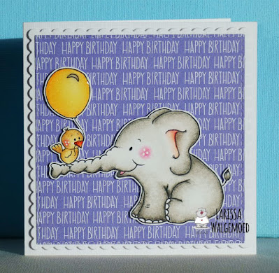 Hi everyone, I am Larissa from Car-d-elicious and today I am posting a new card on the blog from Gerda Steiner designs. This time I have made a birthday card with the digital stamp Elephant and bird from Gerda Steiner designs. I have coloured the image with my Polychromos pencils, the black glaze pen and a white gelpen. I have fussy cut the image. I have coloured the balloon with the Clear Spectrum noir sparkle glitter pen and then I applied Glossy accents on it. With the Crea-nest-lies XXL 34 from Crealies I have die-cut a square from purple patterned paper from the Birthday brights paperpad from My favorite things. I have glued the square on a scalloped square that I have die-cut with the Crea-nest-lies XXL 54 from Crealies from white cardstock. I have glued both squares on a white card and then I glued the image with foamtape on the card. I didn't add a sentiment, because it is already on the patterned paper.