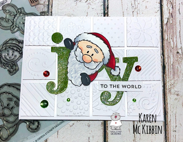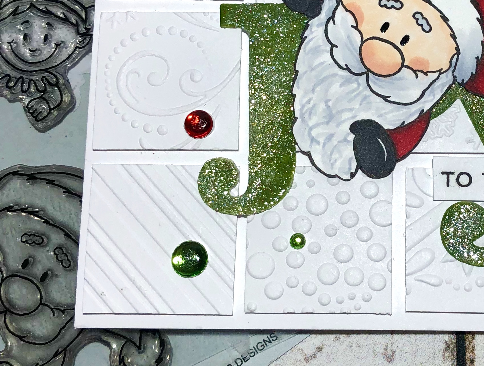 When I reorganized my embossing folders, I die cut tags and embossed those to use as a reference for all my folders. The tags were so pretty and full of texture, that it inspired me to make this card. I cut out 12 - 1 1/4” squares from white cardstock and then used different embossing folders to emboss the squares. Sometimes, I used different areas of the same embossing folder so you don’t even need that many folders. I mounted these squares on foam tape and then adhered them as evenly as possible on my card front. I had thought I could use my T-ruler, but with the foam tape, this was not really possible. In the end, I just spaced all 12 squares out on my card front and carefully adhered them in position. I used glue to adhere the Santa to the word Joy and then onto the card front. I used the “to the world” sentiment from the MFT stamp set Bitty Holiday Wishes and trimmed it down to fit over the”Y”.