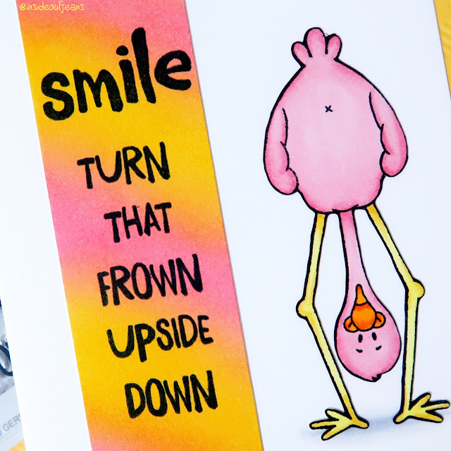 I colored the flamingo in typical pink and yellow colors. I wanted to play off these colors so I used a strip of Bristol Smooth paper with distress inks to create a colorful strip. I love the sentiment being stamped on this since it's pretty bold. I love how the sentiment pops.