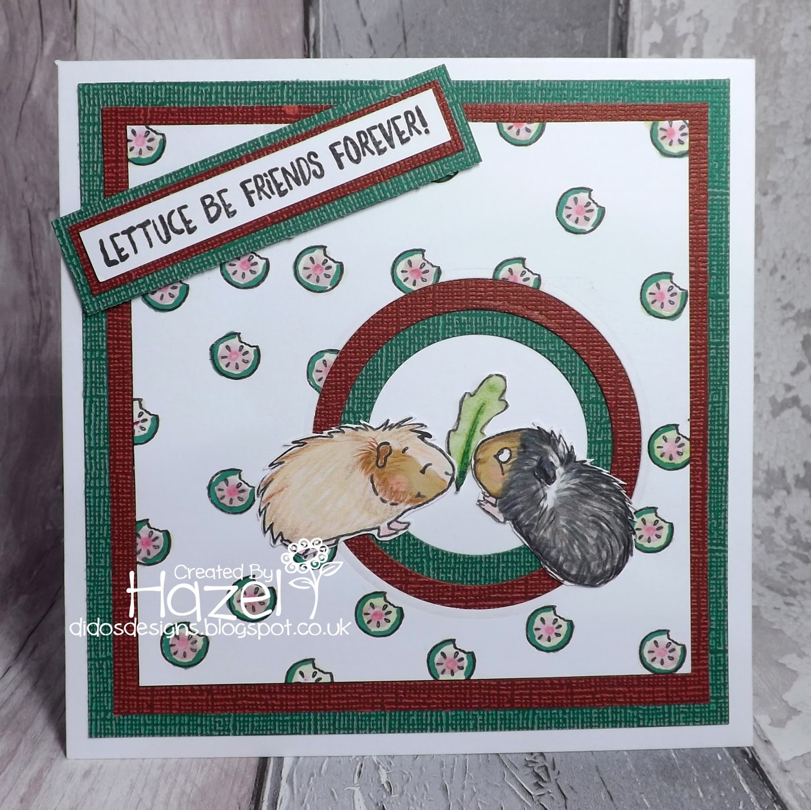 I have been playing with the Wheek Wheek Wheek Set once again. I had a little think about something different and came up with changing the veg to fruit. So instead of the cucumber stamp being a cucumber I coloured it like a wee watermelon.