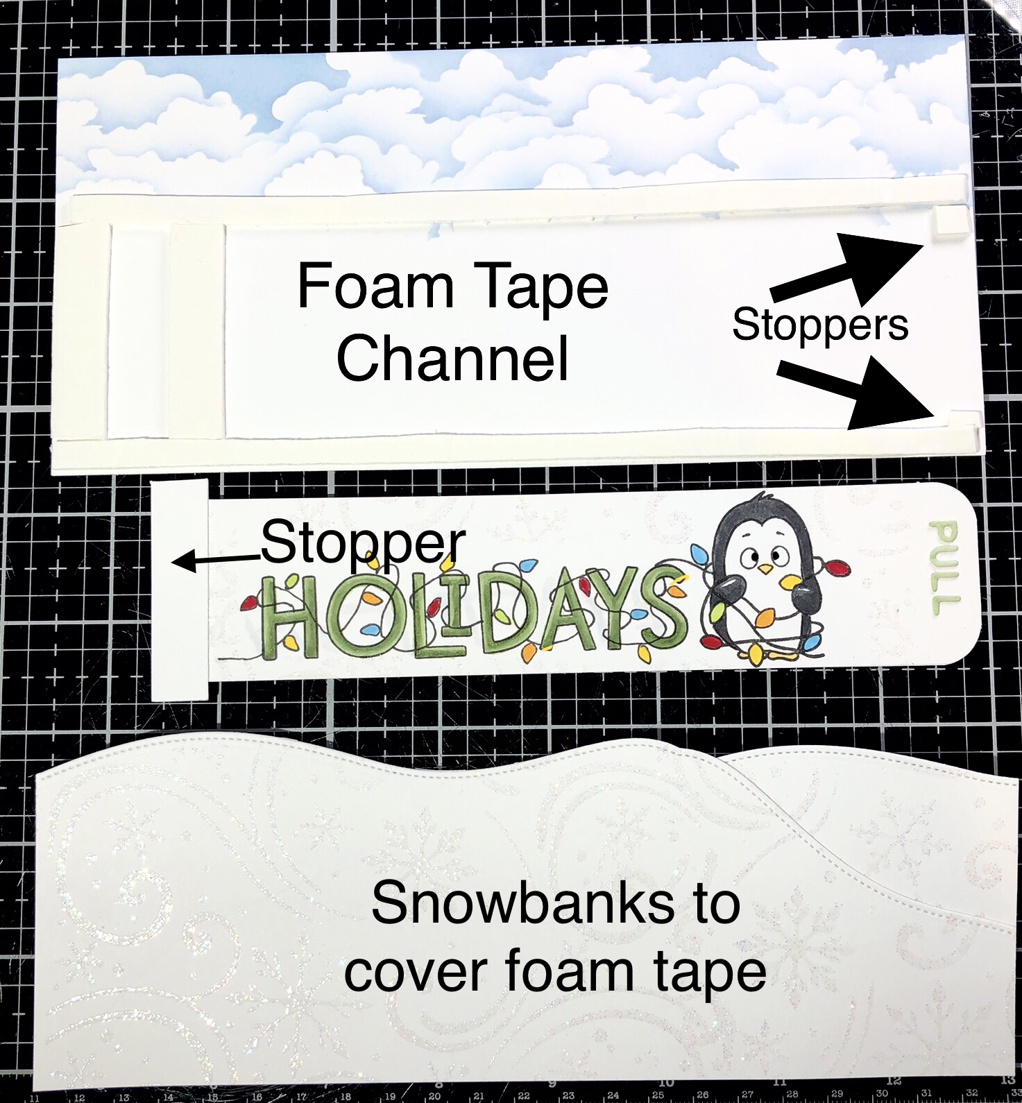 Next, I placed the tab inside the channel, removed the backing paper from the foam tape, and adhered the snowbanks over top to cover all the tape.