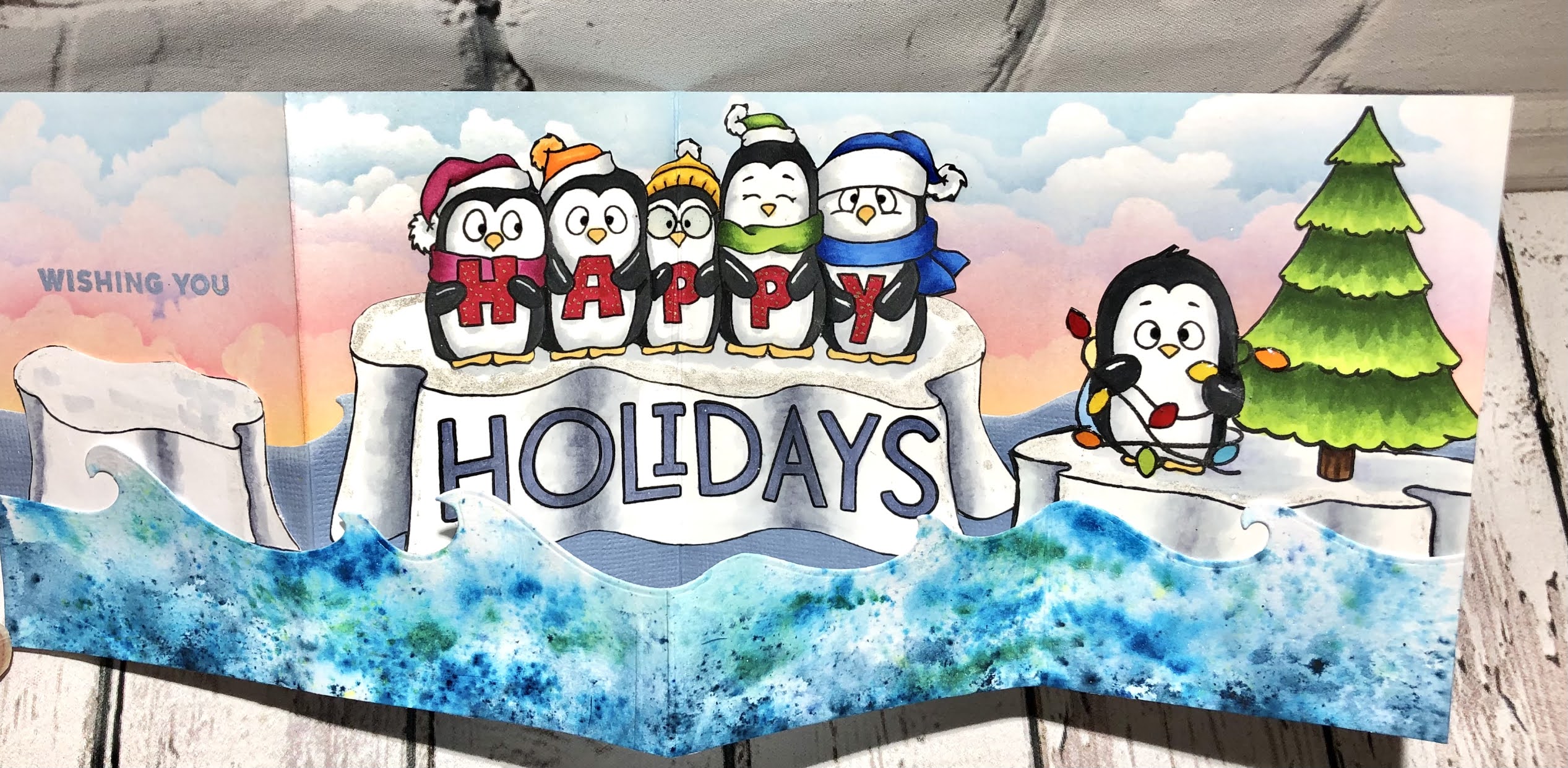I ink blended the background sky using the Cloud Edger stencil from A Colorful Life Designs, using Distress Oxide inks in Warm Honey, Worn Lipstick, Shaded Lilac, and Stormy Sky. I die cut a wave border from some blue cardstock I had in my stash and glued that to my card base. I made the second wave border out of some Brusho crystals and Nuvo shimmer powders and then die cut another wave border. I needed help with drawing the icebergs, so I pulled out my “Make a Splash” stamp set from Craft Consortium and copied the one there. After copic colouring all my images, I glued them to my card base, being careful to keep the inside iceberg and penguins hidden inside. The sentiment on the front of the card is from MFT Stamps Bitty Holiday Wishes and I stamped it in Stormy Sky Distress Oxide ink. Finally, I added some sparkle pen to the icebergs and glossy accents to the Christmas lights.