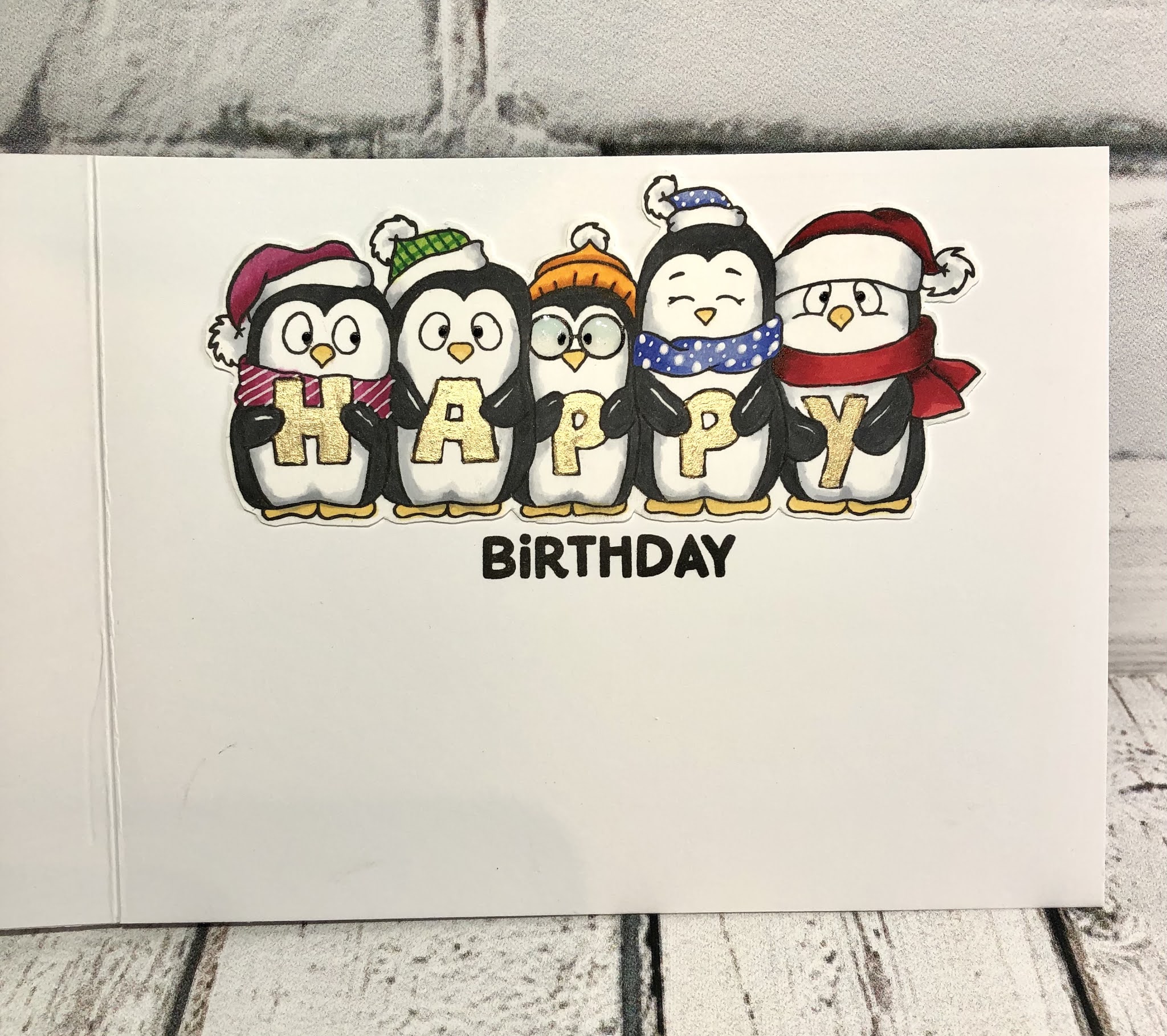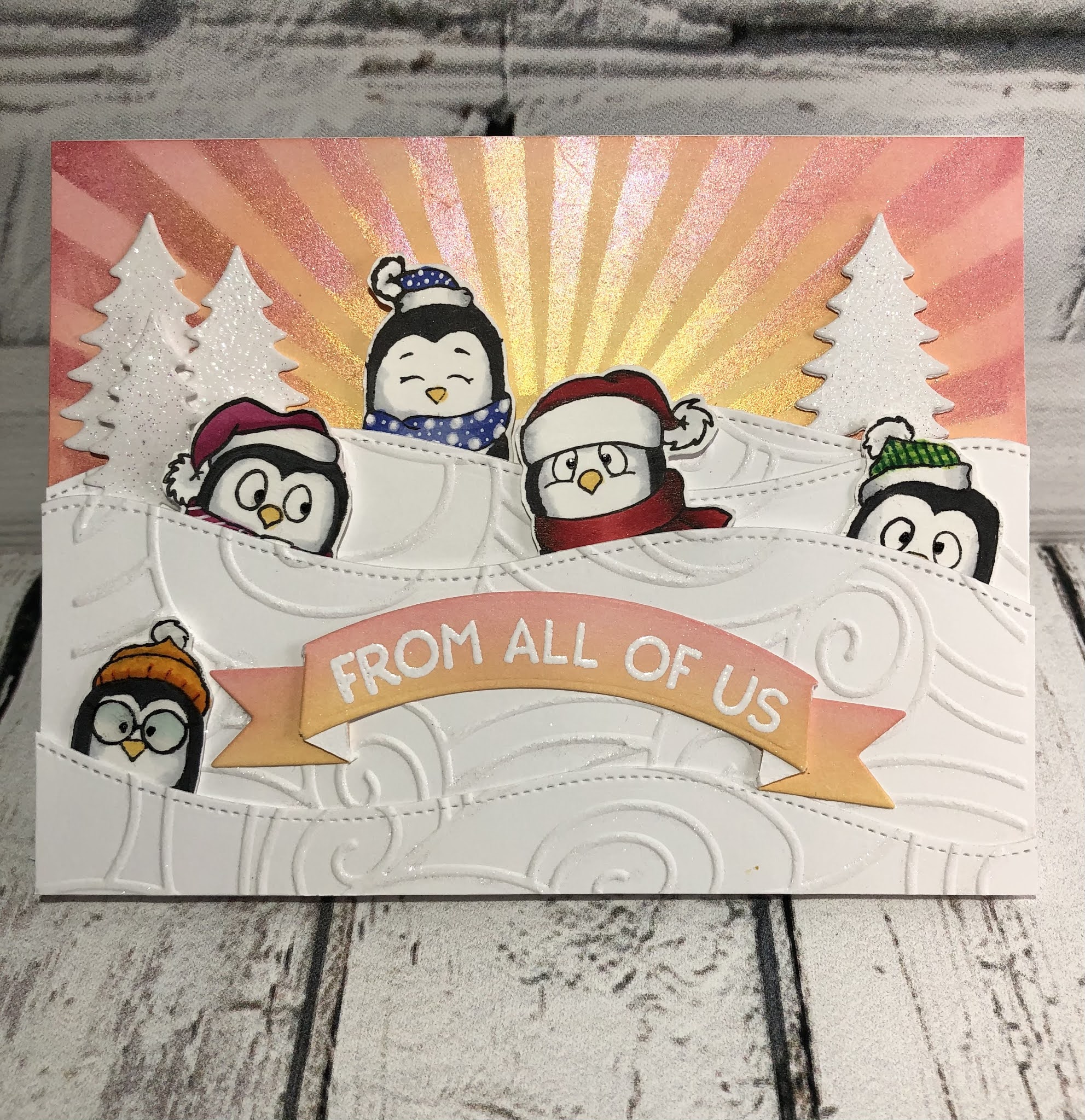 I created the front of this card by ink blending in Distress Oxide ink in Squeezed Lemonade, Dried Marigold, and Worn Lipstick. I placed a sunray stencil over top (mine was MFT Stamps Radiating Rays), dabbed on some Versamark ink and then brushed on some PearlEx powder which gave it a lot of shine and more colour. Next, I die cut some snowbanks and dry embossed them (my folder was from Lifestyle Crafts, called Tide). I used a Nuvo shimmer pen over the raised edges of the embossing. To get the individual penguin images, I masked off alternating penguins and filled in with a copic multiliner pen as needed. I only coloured in the top of the images as they would be hidden behind the snow. For the banner, I ink blended a scrap of cardstock in Dried Marigold and Worn Lipstick before white heat embossing the sentiment which is from the stamp set. I added a few trees from Sunny Studios Woodland Borders die set that I had heat embossed with some Hero Arts Sparkle embossing powder. On the inside, I stamped the “birthday” sentiment from the “Meerkats on the Lookout “ set from GSD before gluing my image above it. This card would be so easy to adapt to whatever holiday was being celebrated by just changing the inside sentiment.