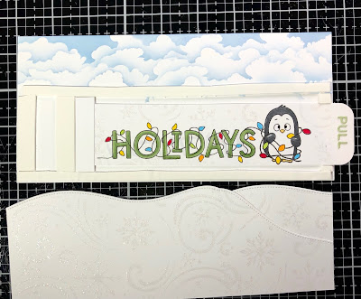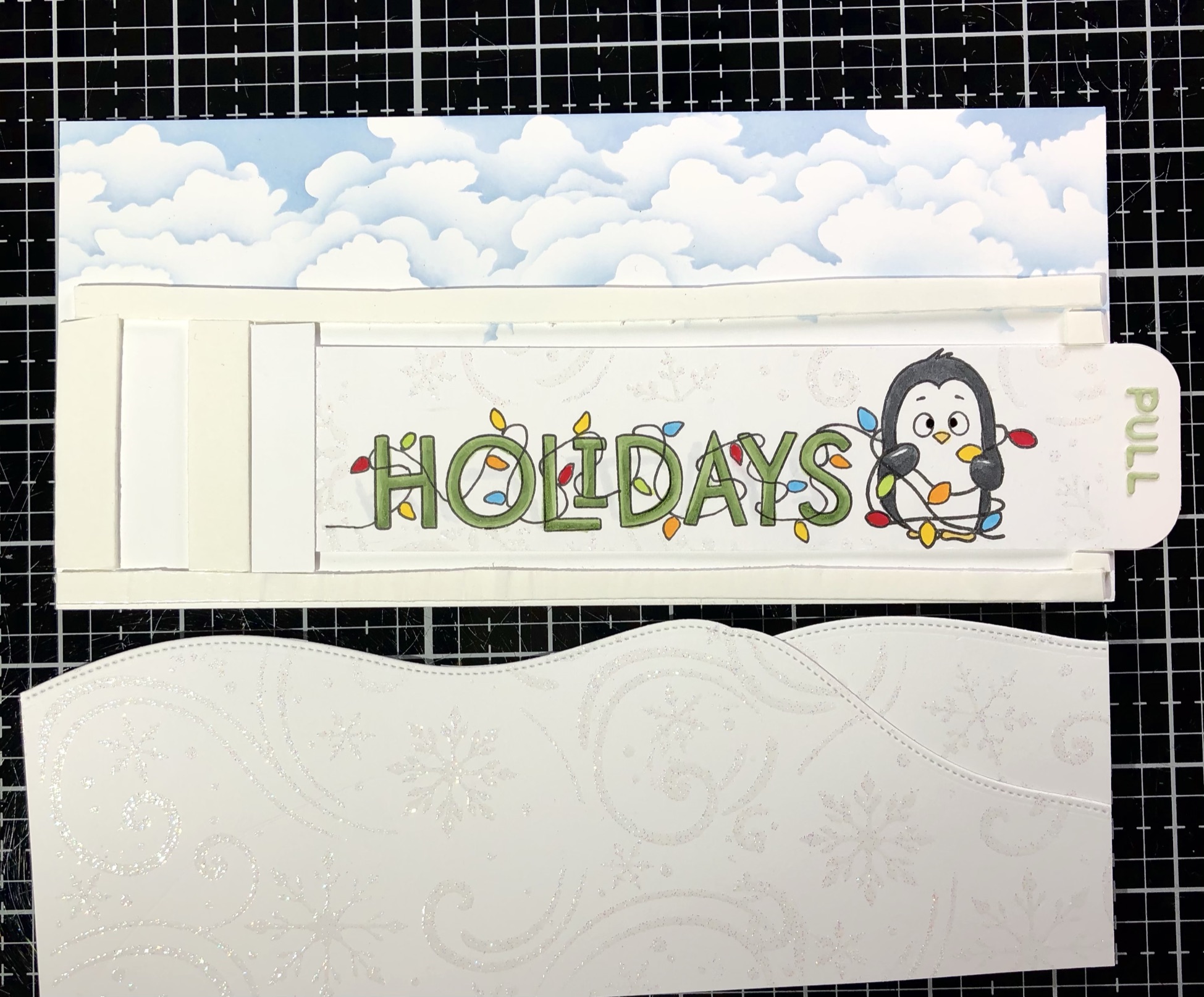 To create the pull tab, I stamped the “Holidays” sentiment next to the tangled Penguin and then drew some lights through the word in a very tangled pattern with a copic multiliner pen. I also used the same stencil and embossing powder to add the snowflake swirls to the pull tab. Next, I added two strips of scrap cardstock at the left hand edge to create a stopper. Finally, I added the word “pull” on the right edge and corner rounded those edges.