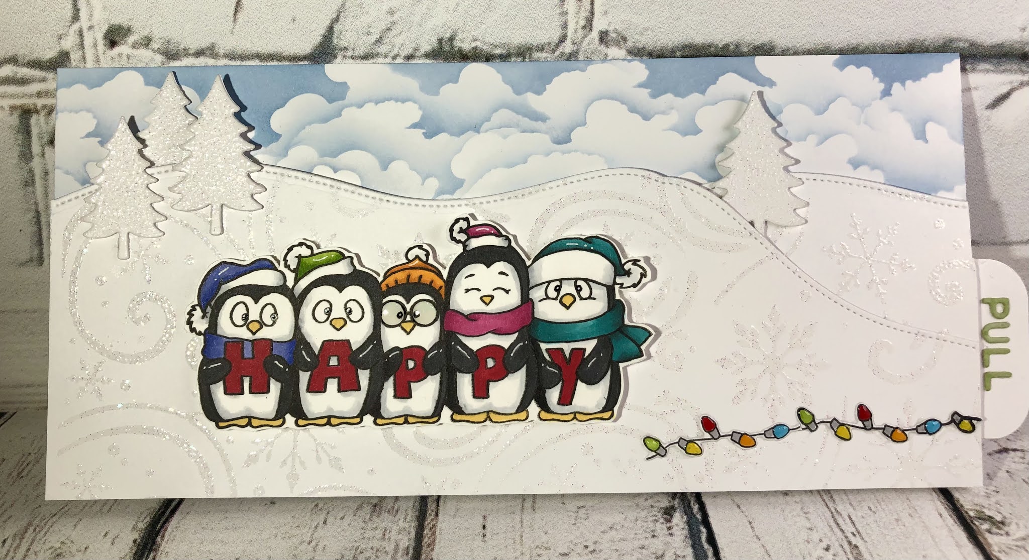 I finished decorating the front of the card by adding the holiday penguins, the embossed trees and a little string of lights leading to the pull tab (this was my son’s idea and I loved it!).