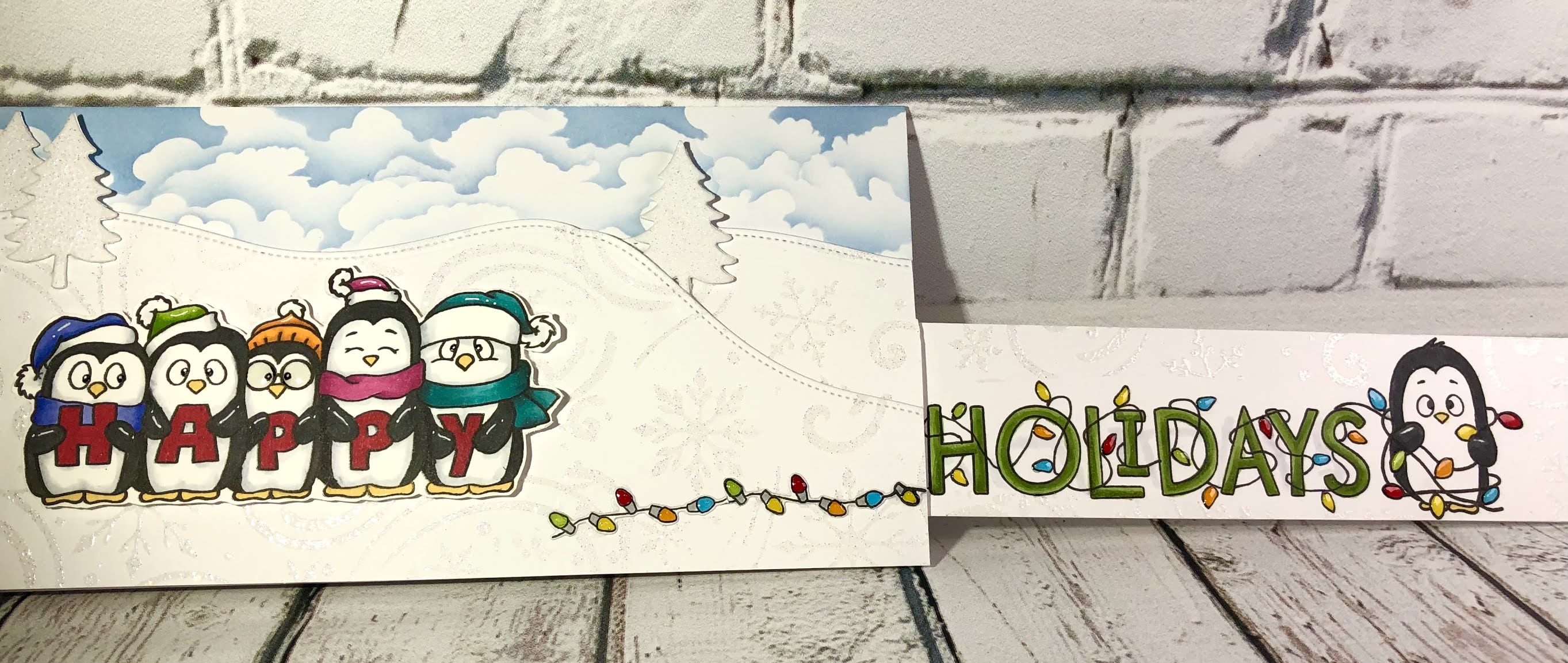 My final card is an 8 x 4” slimline pullout card and again has the Tangled Penguin with the other penguins, only he’s having a little more trouble now! I had intended to make a video for this card but just ran out of time, so I’m hoping the photos will be enough of an explanation.