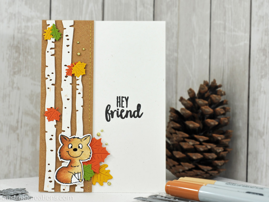 Some tree trunks, some leaves, hand-stitched border in gold, sentiment from the stamp set.