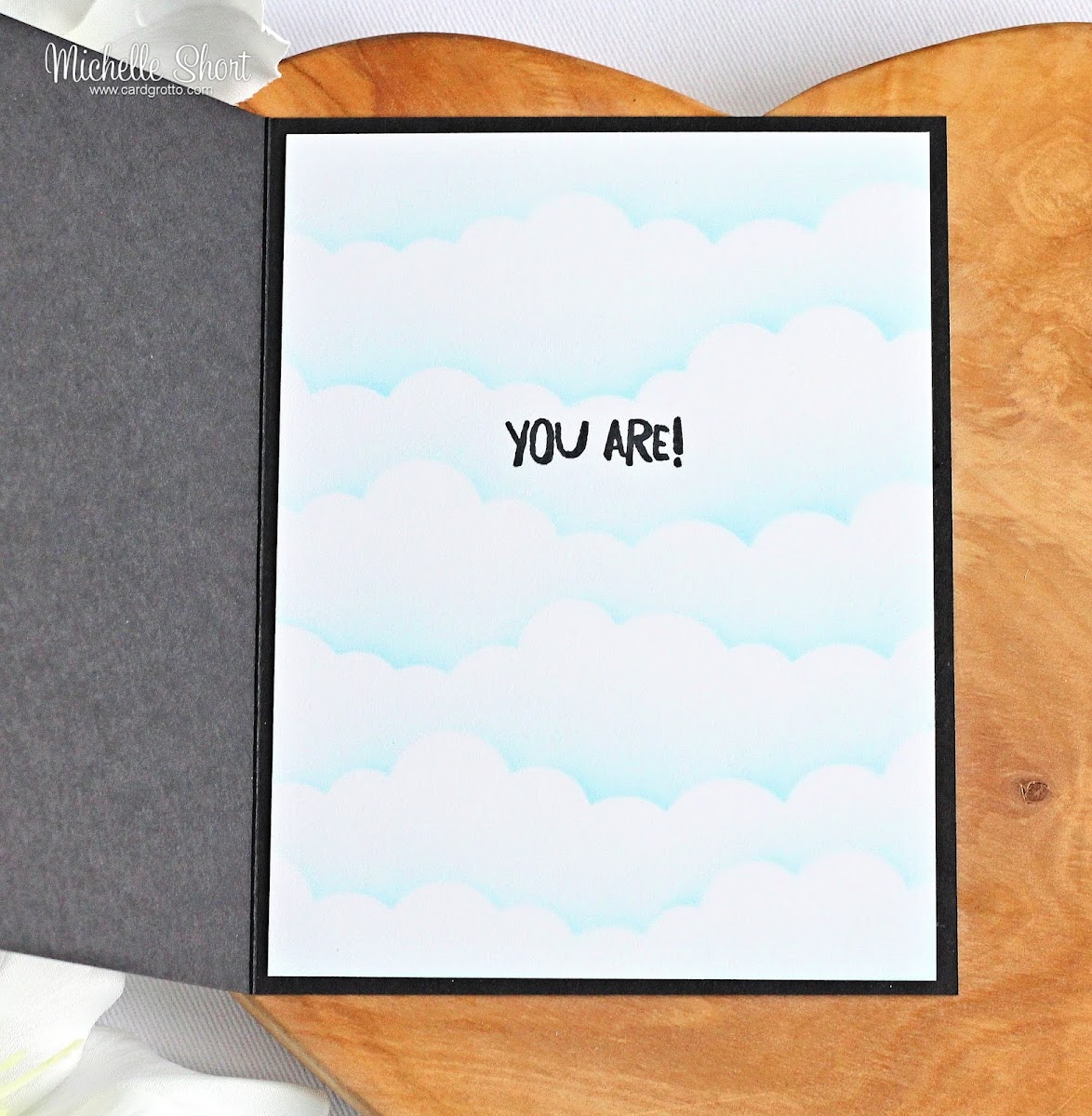 For the inside of the card, I took another panel of white cardstock and created clouds across the background. I then stamped the 'you are!' stamp to complete the sentiment from the front. This was added inside the card with tape runner.