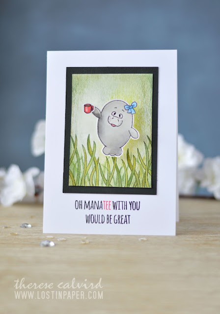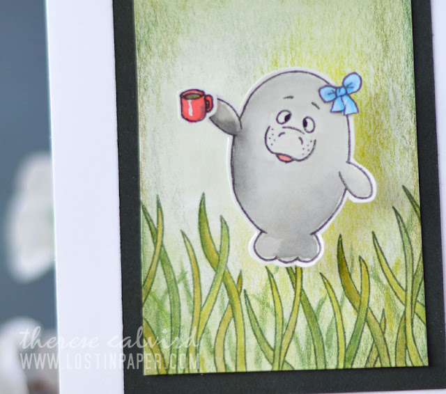 My first card has a super sweet tea drinking  Oh Manatee, I have used a watercolour look but added texture with pencils in the background panel.