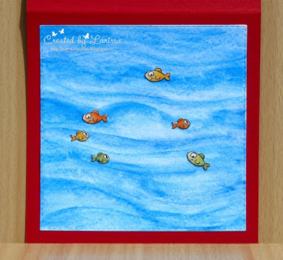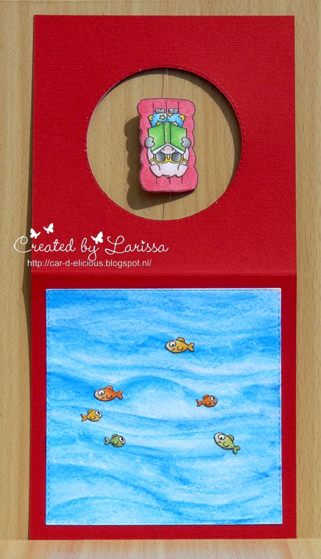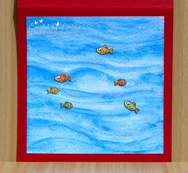 Inside the card I adhered a square shape of watercolor paper. I made a wavy background on it with Derwent inktense blocks. I stamped a couple of fish from the stampset Lucky duck from Gerda Steiner designs and coloured those with my Polychromos pencils. I adhered them on the background, so it just looks like the piggy is floating in a sea. ;)
