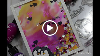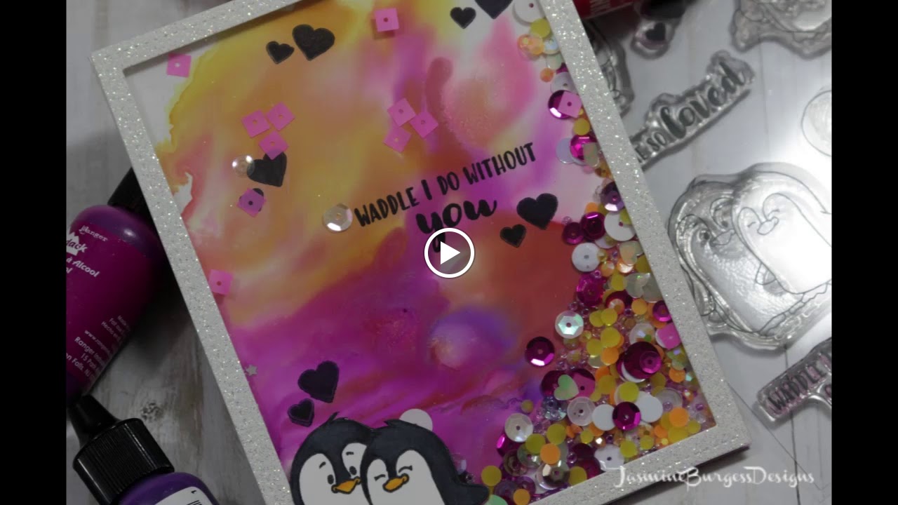 Valentine Penguins is one of those versatile sets that can be romantic, but also lends itself to friendly or encouraging.  My first card was inspired by Empire Penguins with the really colorful feathers on their heads.  I wanted to bring lots of color and excitement to the party and alcohol inks are perfect for that.  As I worked, the ideas coalesced into a shaker card and I love how it turned out.  You can also view the video at my YouTube channel here.