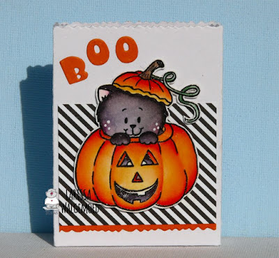 I have glued a strip design paper from the Black and white stripes paper pack from My favorite things on the treat bag. I have die-cut the orange cardstock with the upper edge from the Thinlits treat bag 663096 from Sizzix. I have die-cut the word BOO from orange cardstock with the Mini alpha number & dies from CC designs (retired) and glues those letters next to the image.