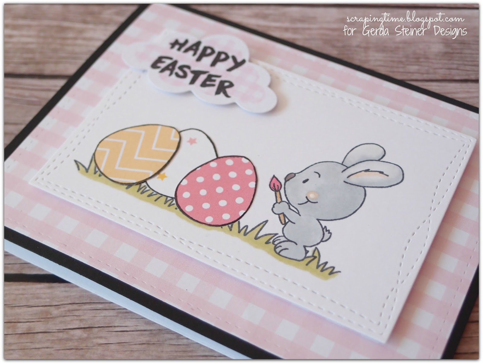 I did some paper piecing since it is one of my favourite techniques! I also did some masking to stamp the three eggs and the grass behind the cute bunny!