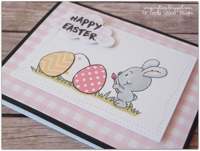 I wanted to make a sweet card and I decided to combine the scene with decorated papers. I chose this light pink one for the panel and also for the cloud where I stamped the sentiment. I coloured the bunny with spectrum noir markers.