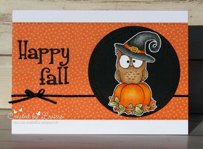 This time I made a card with the stampset Where is the candy from Gerda Steiner designs. This time I used the owl image. I have coloured the owl with my Polychromos pencils and the black glaze pen and then I fussy cut the image. From black cardstock I have cut a circle with the Wonky stitched circle stax from My favorite things and I adhered the image on it with foamtape. On a white card I adhered orange starry design paper from the Beachside petite paper pack from Lawn fawn (retired) after I first tied black ribbon around it. With the Katie alphabet from Quickutz I die-cut a sentiment from black cardstock and I adhered it on the card.