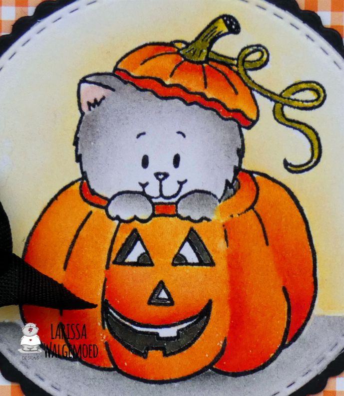I have die-cut the image with the Crea-nest-lies XXL 33 from Crealies and then I glued the image on a scalloped circle that I have die-cut from black cardstock with the Crea-nest-lies XXL 53 from Crealies. I have used a black card. I glued orange patterned paper on the card from the Tiny check brights paperpad from My favorite things after I have die-cut it with the Crea-nest-lies XXL 34 from Crealies and then I glued it on the card. I have tied black seam binding around the front of the card and then I glued the circle on the card. Under the image I have stamped a sentiment from the set Peekin' pumpkin kitty from Gerda Steiner designs.