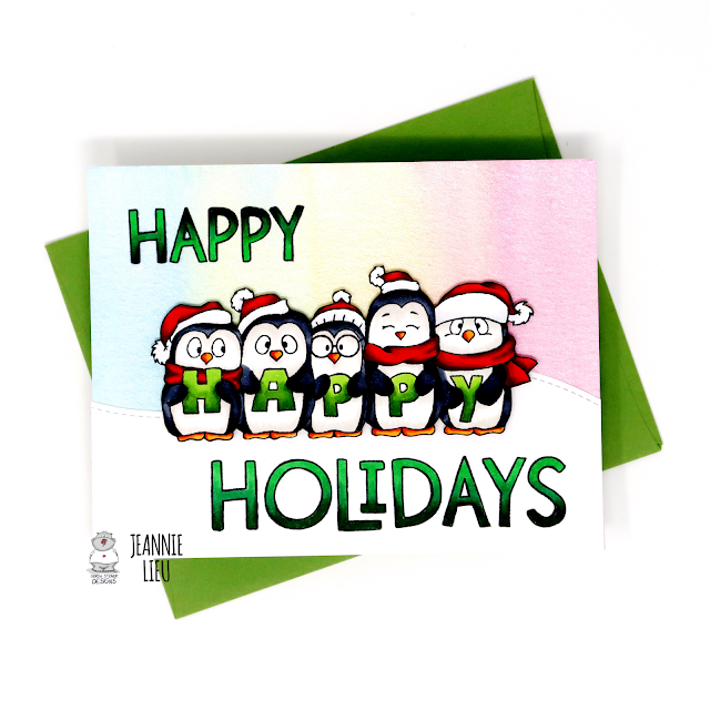 To continue the traditional colors, I used green colors to color in the large sentiments and added the penguins on a snowbank.