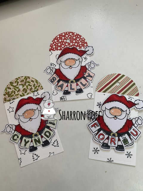 And how cute is this?! For my second project, I made these personalized gift tags using this set! Any 5 letter name or nickname fits perfectly on the banner. Use your favorite tag die, stamp a background with the teeny stamps that are included in the set, then add your die cut Santa. Super quick and super cute!