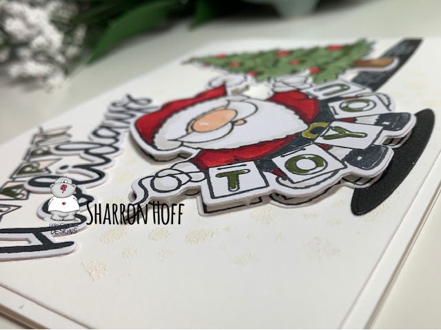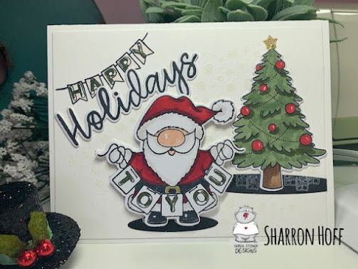 Santa is adorable and imagine how many ways you can embellish him with trees presents, sleigh, reindeer, or anything else you want to show him off! I used this Christmas tree by My Favorite Things and added a second banner by Taylored Expressions for the "happy". I have so many ideas how to use this sweet Santa stamp.