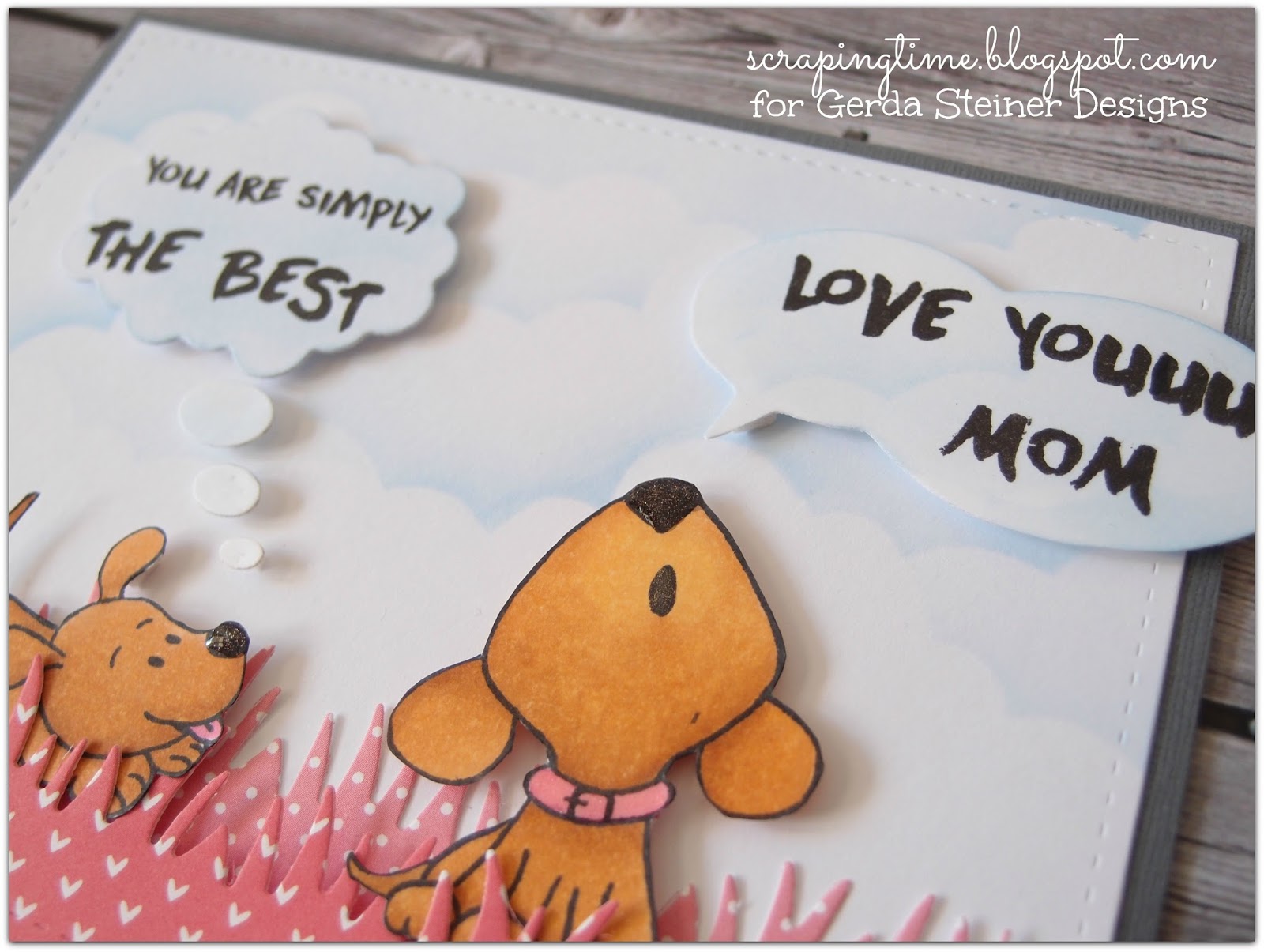 I die cut a cloud and a balloon bubble and I stamped both sentiments. The first one is from the Happy Hoppy 4x6 Bunny Stamp Set (You are simply the best) and the second one is a mixture of a couple of sets. Firstly, I stamped the "love you" stamp from the "Brush bunny" stamp set and I added a couple of "u" since I really love the idea of the original set where the dog is singing Happy Birthday to youuuuuuuuuuu!!! And I thought it could be cute to copy it!