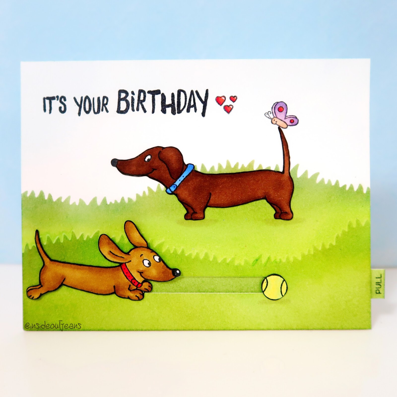 I used two sentiments in this card: It's Your Birthday and Have A Ball. The first one is prominent on the front of the card, but the second one is hidden until the dog fetches the ball. It's a small surprise for the card recipient.
