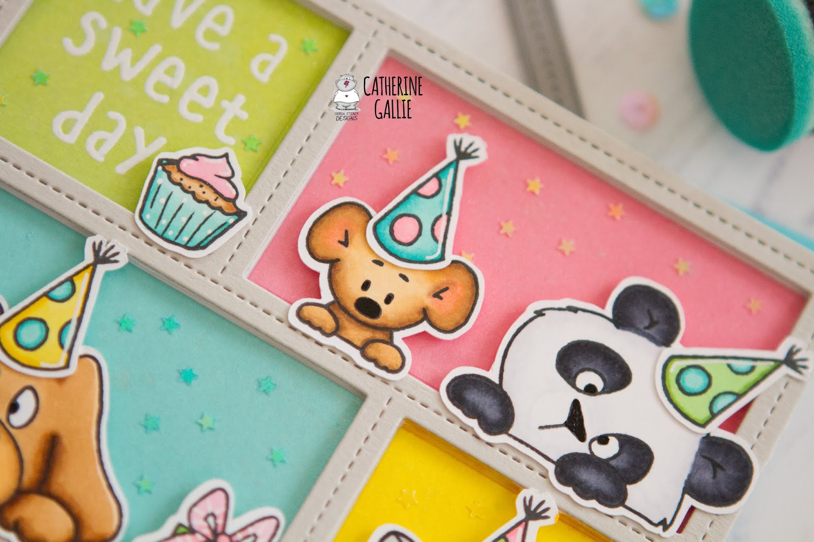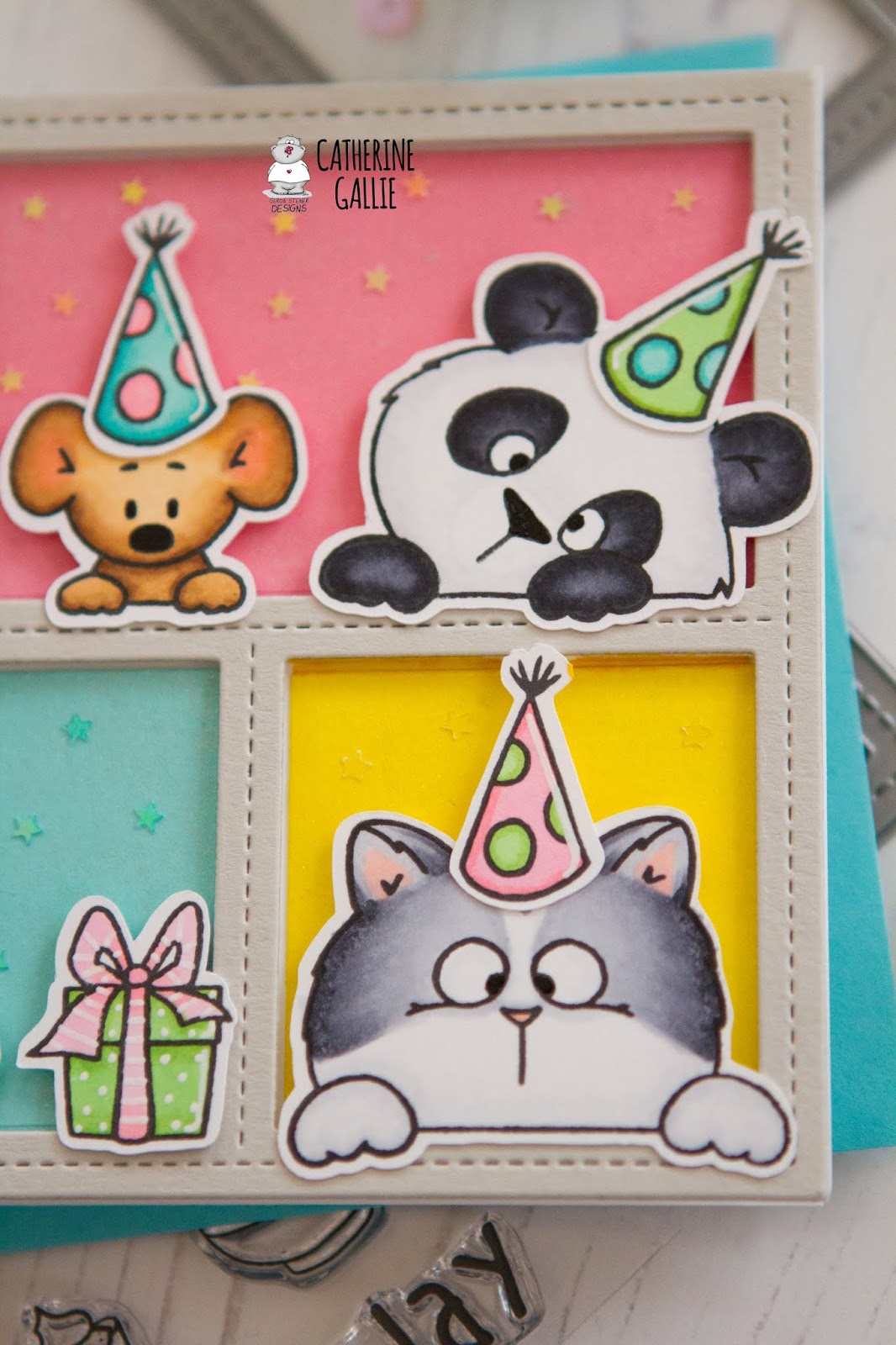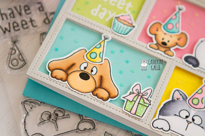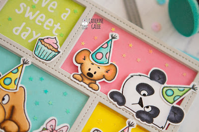 First I stamped and coloured the images using copic markers and then cut them out using my Scan n Cut although there are coordinating dies in the store. I attached party hats to each critter and I then set them aside while I created the rest of the card.