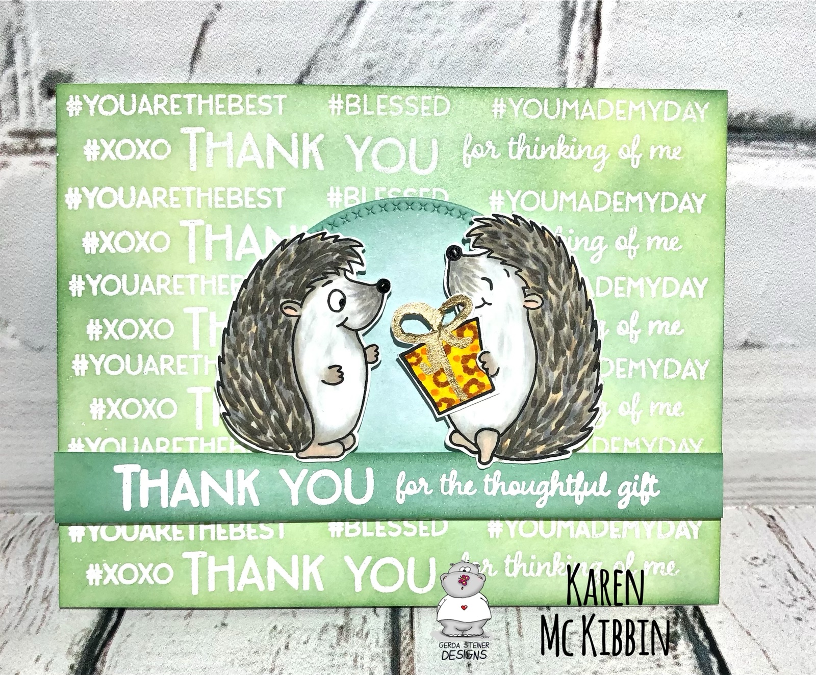 Hello and thanks for stopping by. It’s Karen here today and I hope everyone had a very happy Christmas, however it was celebrated this year. I’m finding myself very much in need of some thank you cards at the moment, and luckily the Hedgehog with Gifts stamp set from Gerda Steiner Designs has come to my rescue. There are so many great sentiments in this set, and I just couldn’t decide which ones to use, so I used them all! *Big grin*