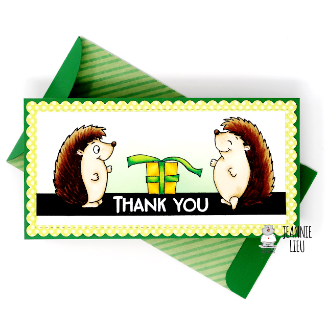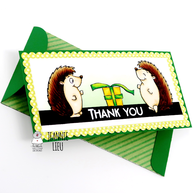 Hi everyone! It’s Jeannie (InsideoutJeans) on the blog today with Gerda Steiner Design’s stamp set named, Hedgehog with Gifts. I wanted to take a break from the holiday cards, so this set was perfect for a simple thank you card.