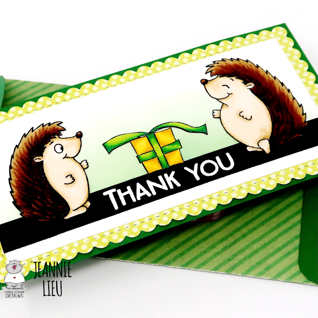 I placed the gift right in the middle since I thought if the hedgehogs were holding the gift, it took away from the two of them since it's rather large. I also created a mini slimline envelope using a die that matched the card. I just thought it was so perfect!
