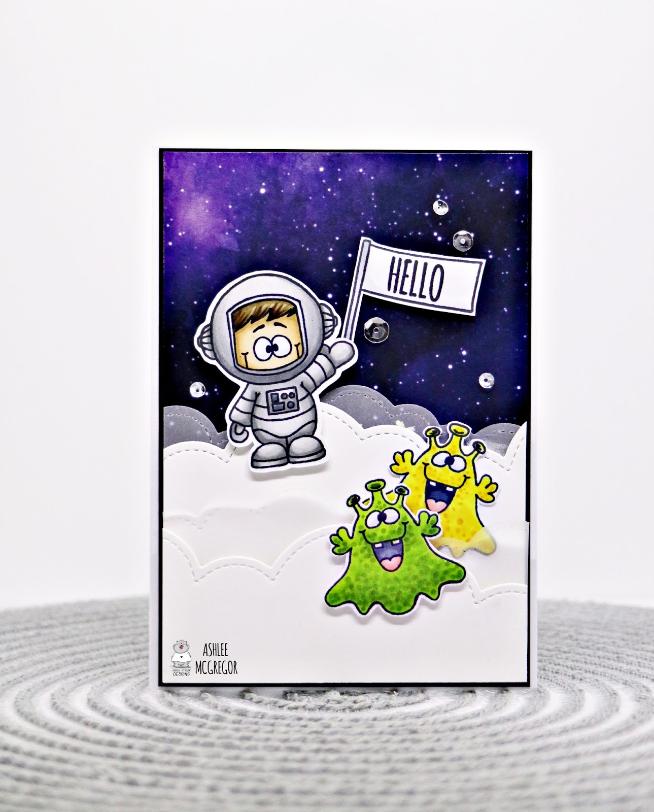 I coloured and cut two of the cute little aliens, the awesome little astronaut and the flag then added them onto the card base with some foam tape for added dimension.