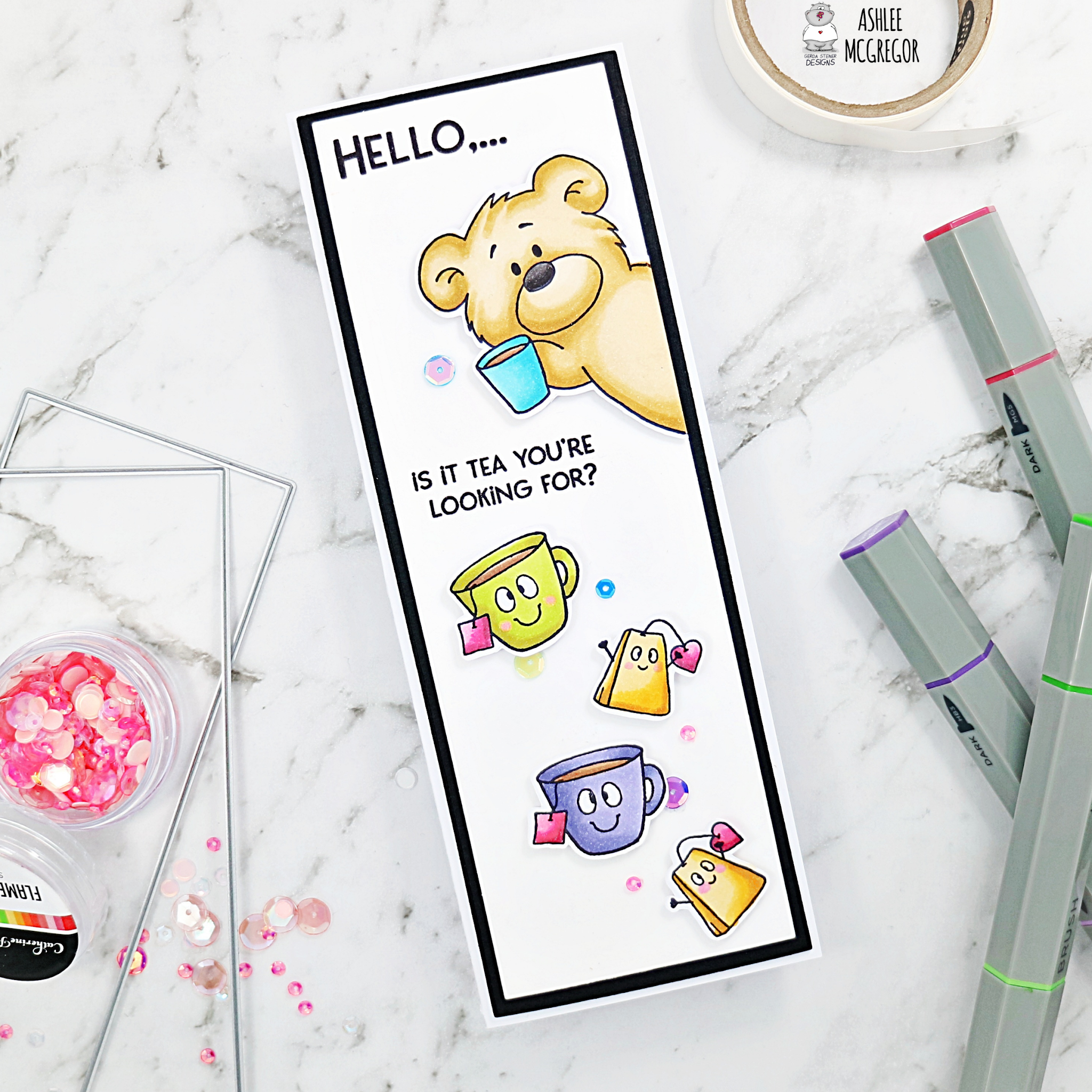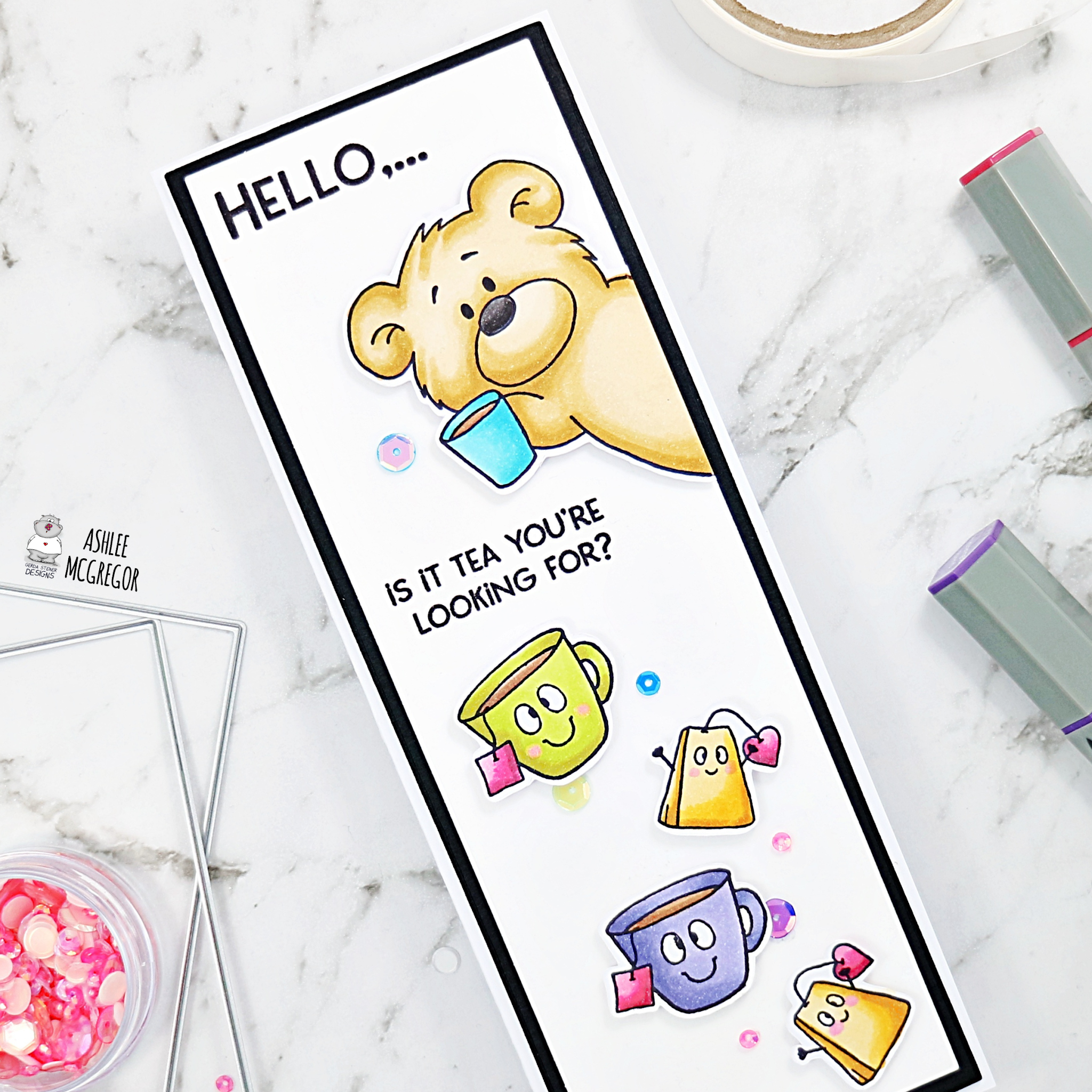 I thought the bear popping in from the side would be perfect for a slimline card along with the super cute cup and tea bag!!