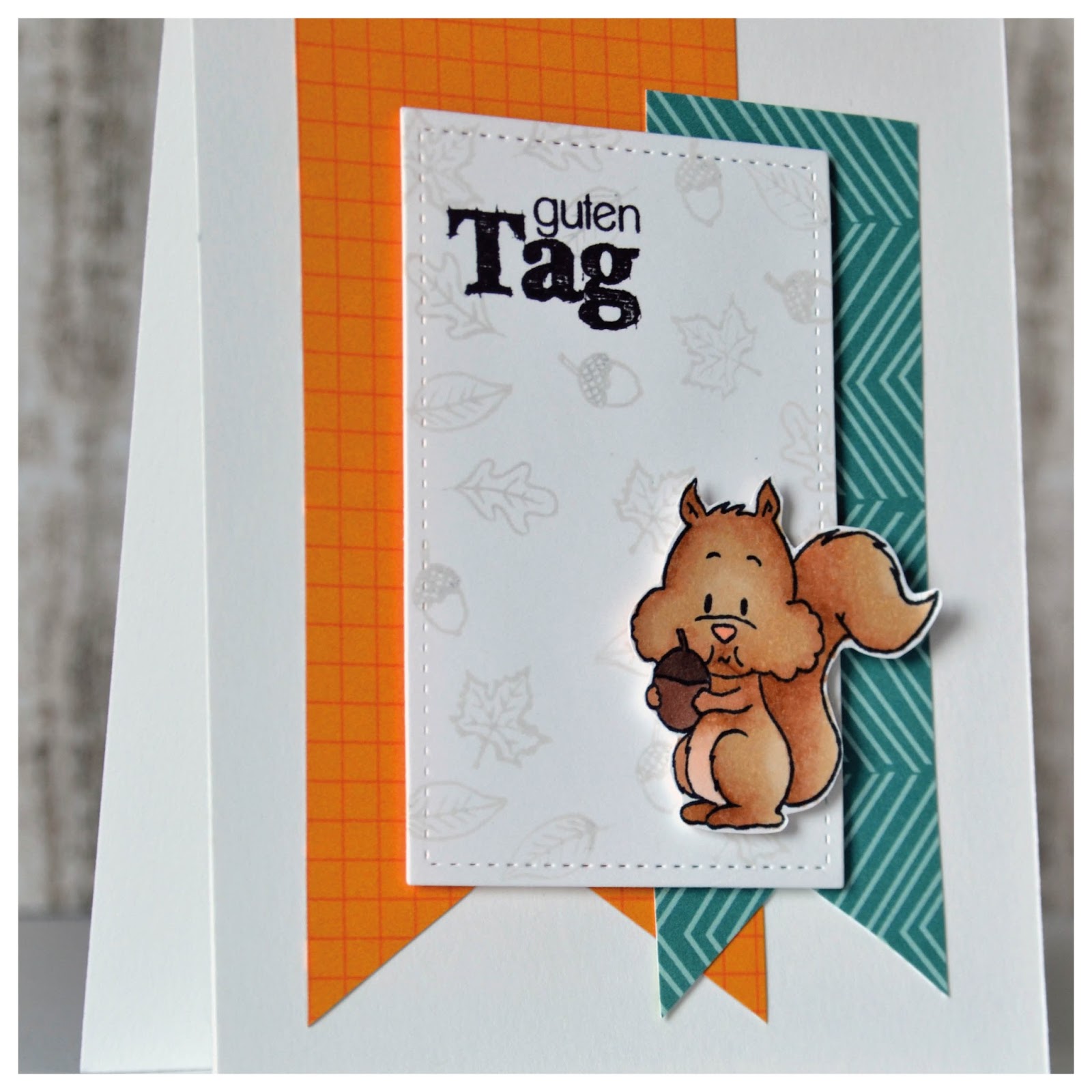 Afterwards, I stamped all the little leaves with a light grey on a little white piece of paper. That way you can get a great soft background whereas the main focus lays on the critter in front. My sentiment is in german, it's a greeting and means something like a formal "Hello". Everything glued with some foam tape and the dimensional card is finished!
