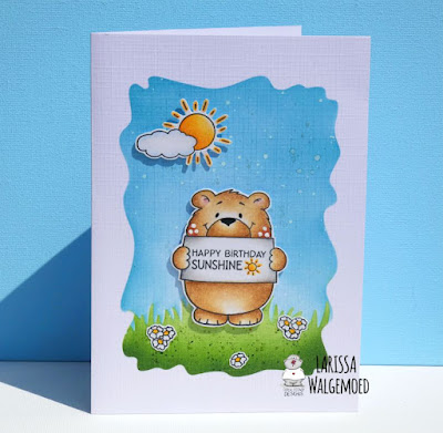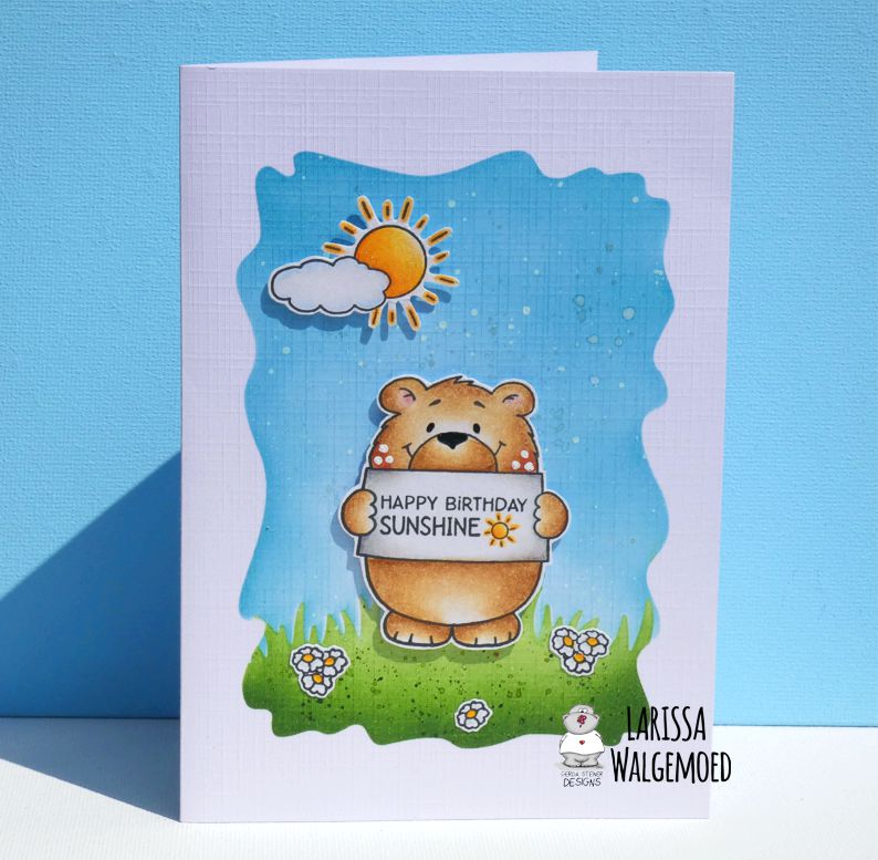 Hi everyone, I am Larissa from Car-d-elicious and today I am posting a new card on the blog from Gerda Steiner designs and this time I have made a card with the clear stamp set Hello sunshine from Gerda Steiner designs. For my card I have stamped the images of the bear and the sun and cloud and then I coloured them with my Polychromos pencils, the black glaze pen and a white gelpen. I have coloured both suns with the Clear Spectrum noir sparkle glitter pen. I have fussy cut both of the images.