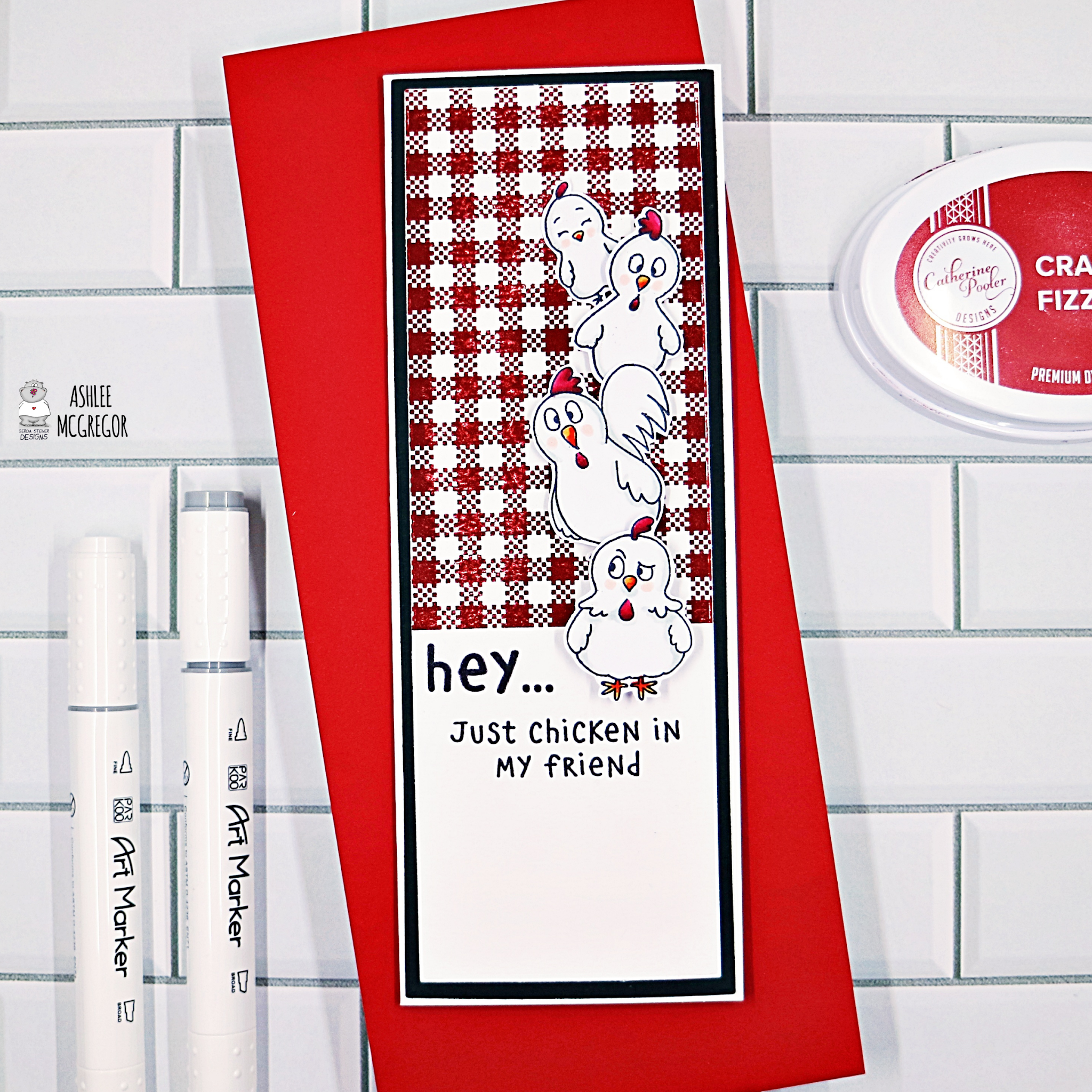 Ashlee here with another card to share with you and this one is a slimline with the super duper cute chickens from the "Chicken scratch" stamp set....