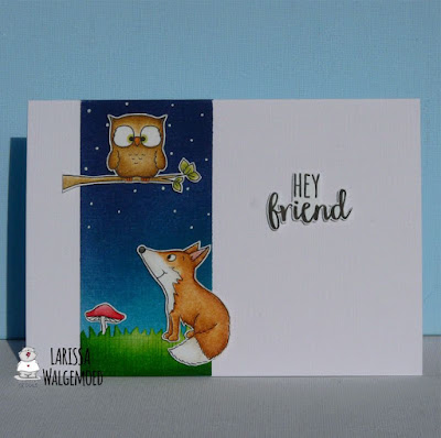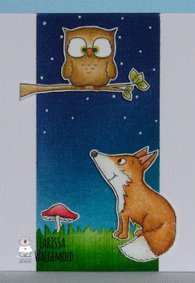 Mowed lawn and Lucky clover distress ink to colour the grass. I glued all the images and the grass on the card. I stamped a sentiment from the set Foxes from Gerda Steiner designs on white cardstock and fussy cut it. I used foamtape to adhere it on my card. With a white gelpen I added some dots on the coloured strip on the card to make it look like a starry night.